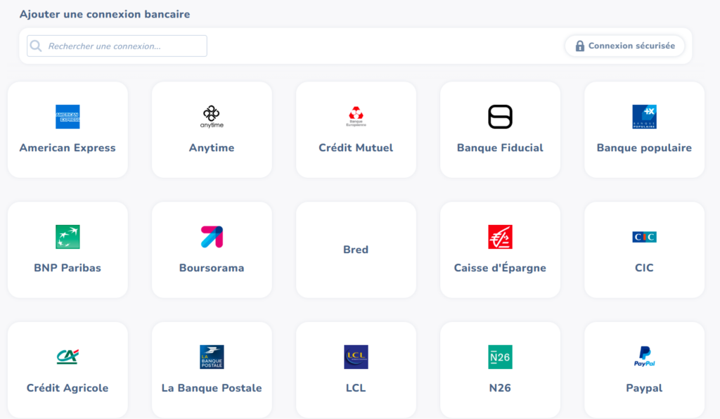 3.3 Après avoir cliqué sur « Ajouter un compte », trouvez votre banque et suivez le parcours pour créer un pont entre Tiime et votre solution bancaire.
